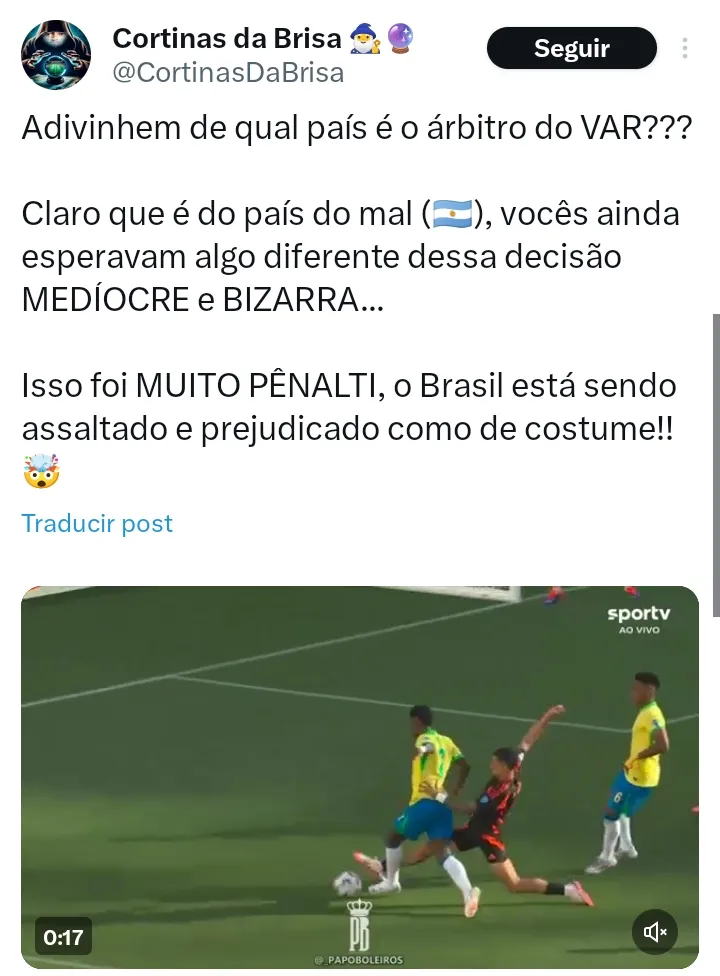 “¿Adivinen de qué país es el árbitro del VAR? Claro, es del país del mal. Todavía esperaban algo diferente de esta decisión bizarra y mediocre. Da mucha pena. Brasil está siendo robado y perjudicado como siempre”, se quejó un hincha a través de X.