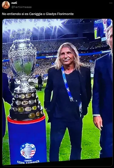Una vez que todos los espectadores tomaron su lugar, arrancó la ceremonia previa, protagonizada primero por leyendas de Conmebol. Claudio Paul Caniggia y Óscar Ruggeri, junto a Mario Yepes e Iván Córdoba, llevaron el trofeo hacia la cancha y el Pájaro no pasó desapercibido.