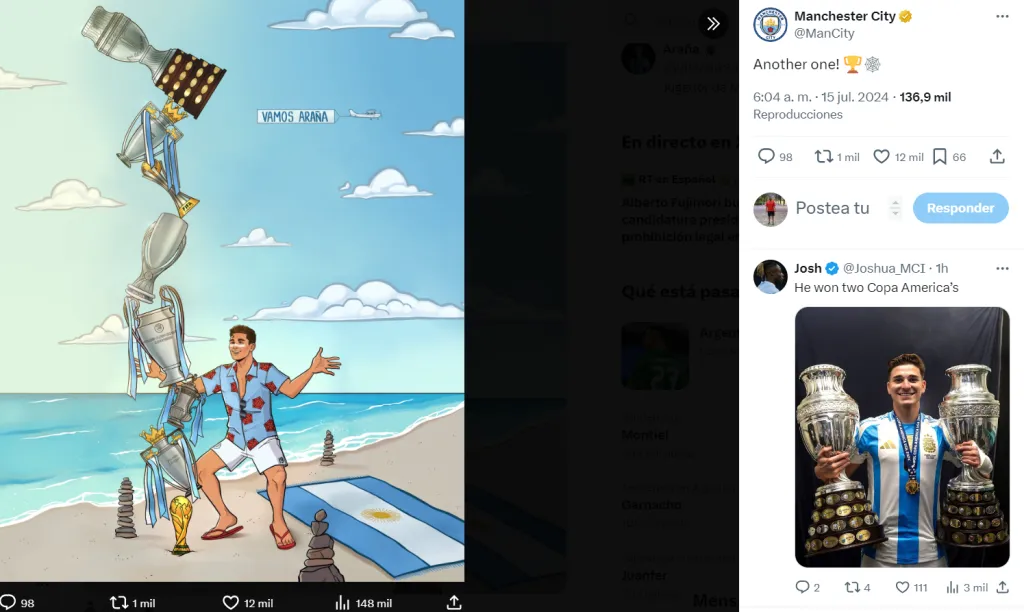Con apenas 24 años, Julián Álvarez obtuvo un nuevo título en su carrera y ya son 16 las vueltas olímpicas que dio el cordobés en su trayectoria. La Araña se coronó en River, la Selección Argentina y Manchester City y justamente, el equipo inglés utilizó sus redes sociales para felicitar al delantero.