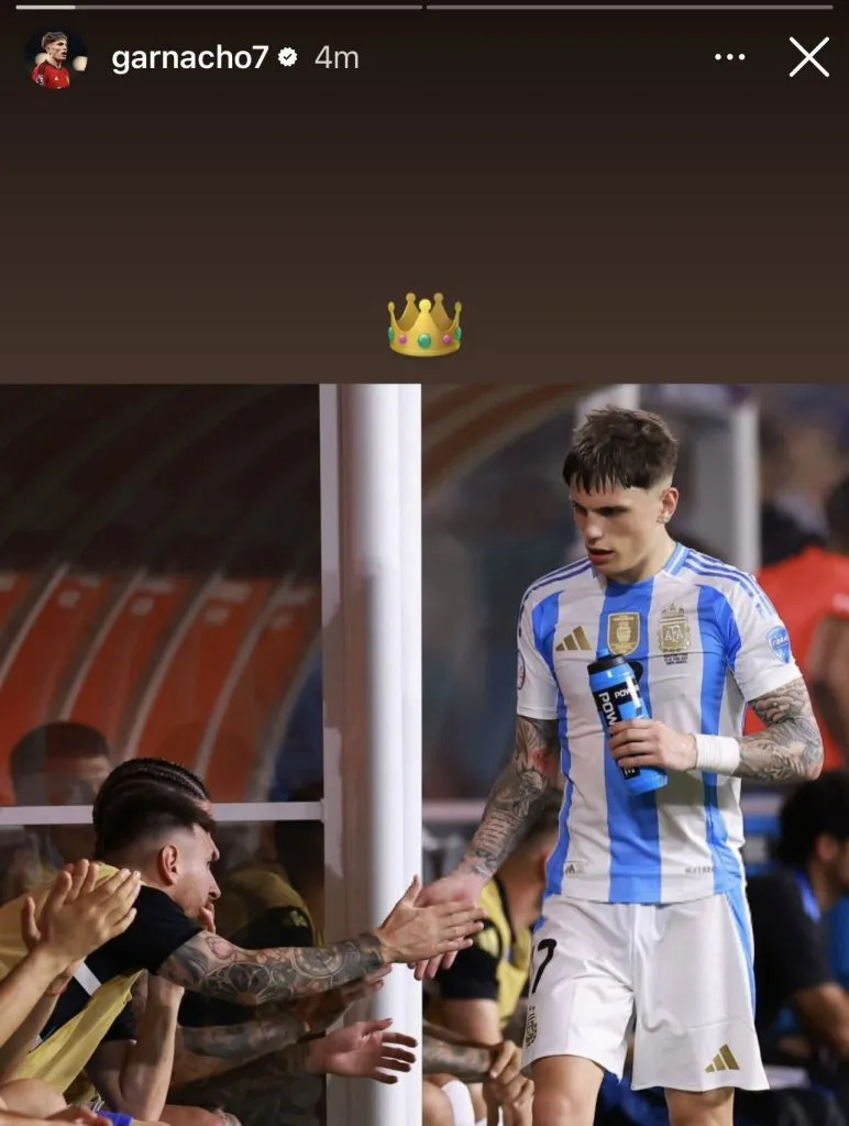 Haciendo eco de la foto que retrató el saludo entre ambos cracks argentinos, Garnacho posteó la imagen en su cuenta de Instagram junto con una corona, aludiendo a que Leo Messi es el rey. Cabe destacar que el joven de 19 años ya se refirió a Messi de esta manera en otras ocasiones.