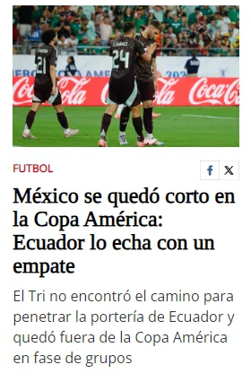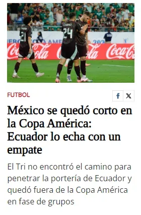El portal El Sol de México también fue contundente para titular su portada deportiva: “México se quedó corto en la Copa América: Ecuador lo echa con un empate“. La Jornada, en cambio, se limitó a solamente informar la eliminación pero fue duro con el entrenador, Jaime Lozano.