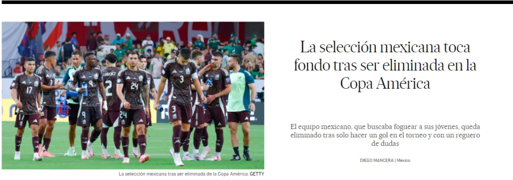 El diario El País, por ejemplo, tituló: “La selección mexicana toca fondo tras ser eliminada en la Copa América“. Y dentro de la noticia de la derrota, el medio informativo fue incluso más duro: “México, desde 2019, va de fracaso en fracaso: Nations League, Mundial y ahora la Copa América. […] Los grandes prospectos mexicanos piden más minutos y apenas los tendrán tras el revés de este domingo. México se lamenta y se aleja del fútbol, aunque sea por un rato“.
