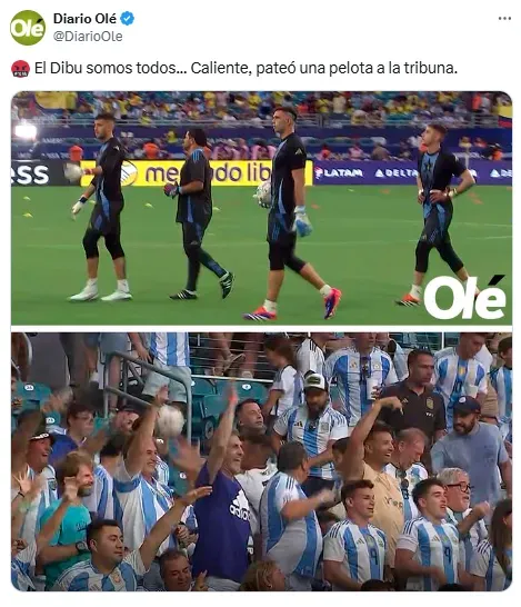 Uno de los que reaccionó de manera notoria fue Emiliano Martínez, agarrando una de las pelotas que estaban utilizando los arqueros argentinos en el calentamiento y lanzándola a la tribuna con una patada. Inmediatamente, el gesto de Dibu comenzó a circular en redes sociales.