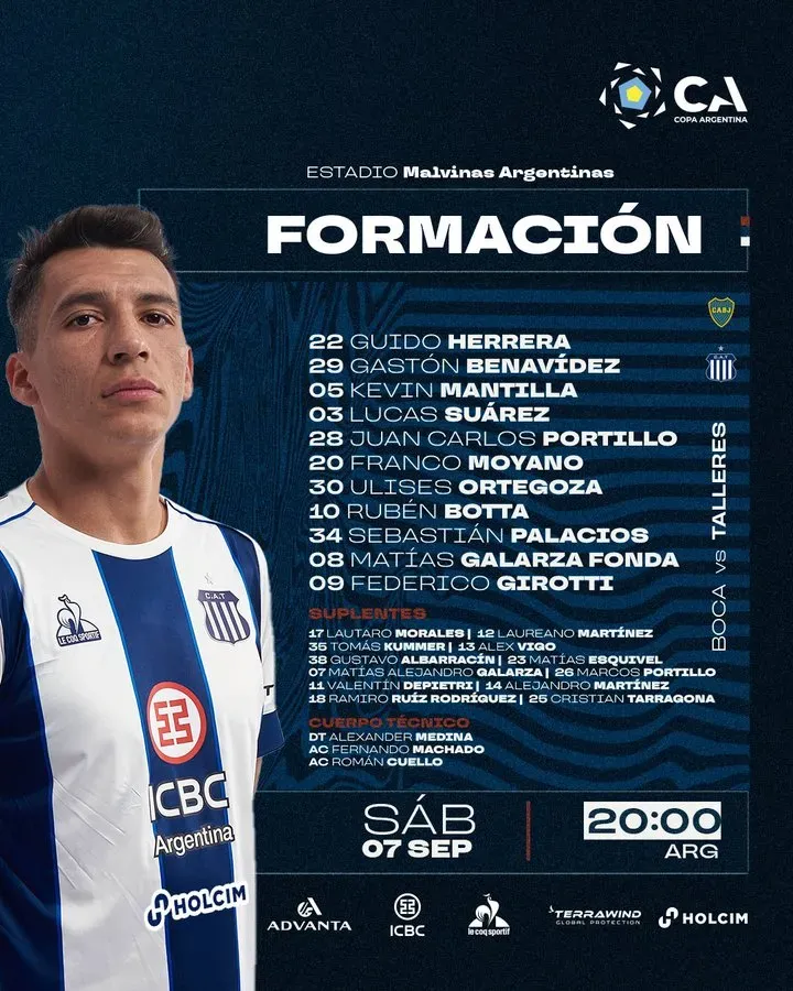 Para enfrentar a Boca, la formación que eligió Alexander Medina en Talleres está compuesta por Guido Herrera; Gastón Benavídez, Kevin Mantilla, Lucas Suárez, Juan Carlos Portillo; Franco Moyano, Ulises Ortegoza; Rubén Botta; Matías Galarza Fonda, Federico Girotti y Sebastián Palacios.