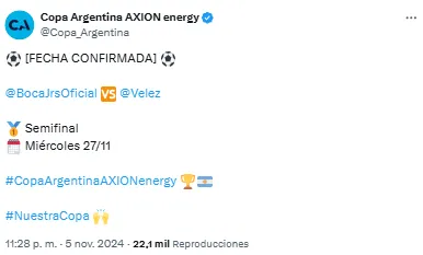 Tras la polémica por el deseo de las dirigencias, AFA confirmó que los clubes se enfrentarán el miércoles 27 de noviembre con horario y sede a confirmar. Así, el club presidido por Juan Román Riquelme ganó la pulseada en la disputa por la elección de la fecha.