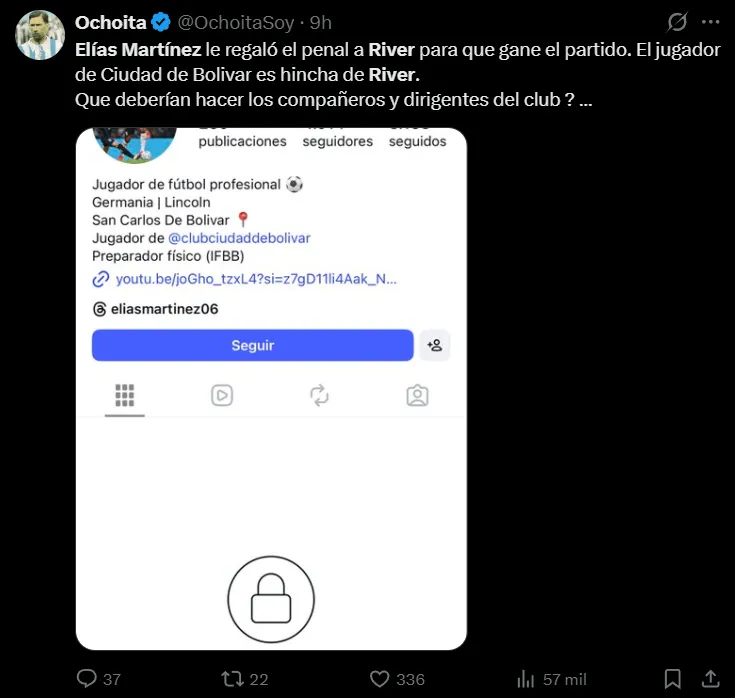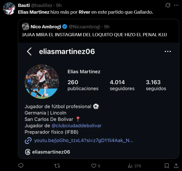 Por otro lado, el propio Elías Martínez se presenta como “ex River” en su cuenta de X, aunque su debut en Primera División lo hizo jugando para Tristán Suárez y recién está haciendo su segunda experiencia en Primera Nacional, donde ya había defendido la camiseta de Guillermo Brown de Puerto Madryn.