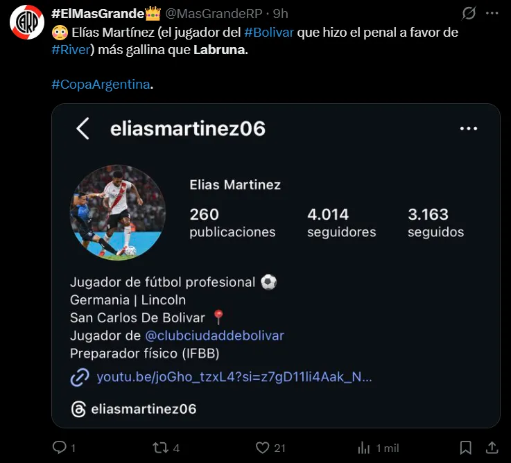 “Elías Martínez hizo más por River en este partido que Gallardo”, fue uno de los comentarios. “Elías Martínez le regaló el penal a River para que gane el partido. El jugador de Ciudad de Bolívar es hincha de River. ¿Qué deberían hacer los compañeros y dirigentes del club?”, se manifestó con indignación desde otro. “Más gallina que Labruna”, fue por otro lado una de las frases más reiteradas haciendo referencia al jugador que cometió el penal que salvó al equipo de Marcelo Gallardo.