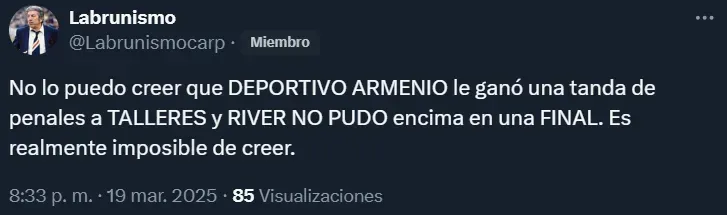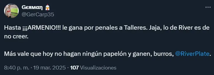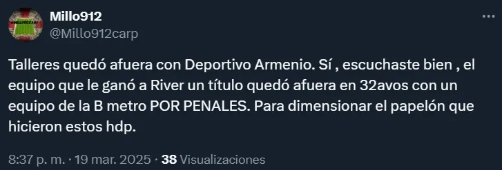 Sucede que, dos semanas atrás, el Millonario empató sin goles con Talleres en Asunción del Paraguay y por la Supercopa Internacional, luego de jugar un muy mal partido. Luego, en los penales y pese a la gran actuación de Franco Armani, pasó la entidad de Córdoba.