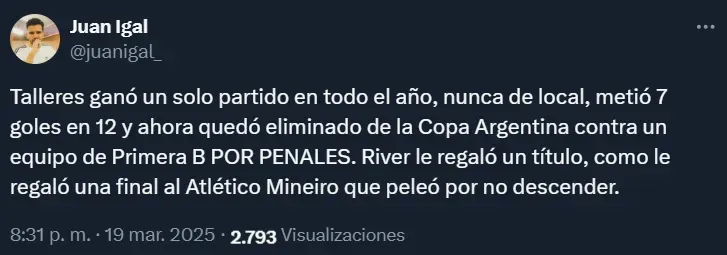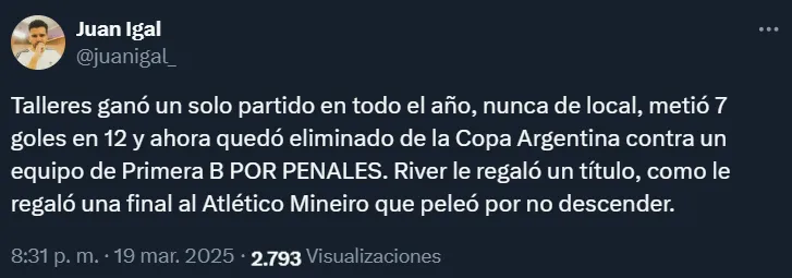 En medio de ese panorama, los fanáticos de River pusieron el grito en el cielo e hicieron tendencia esta situación, quejándose contundentemente por la poca efectividad que tuvieron los de Marcelo Gallardo ante un rival que no anda nada bien como Talleres.