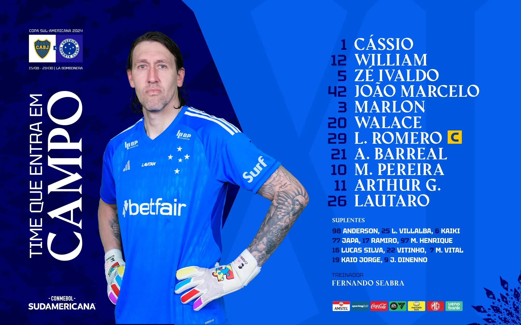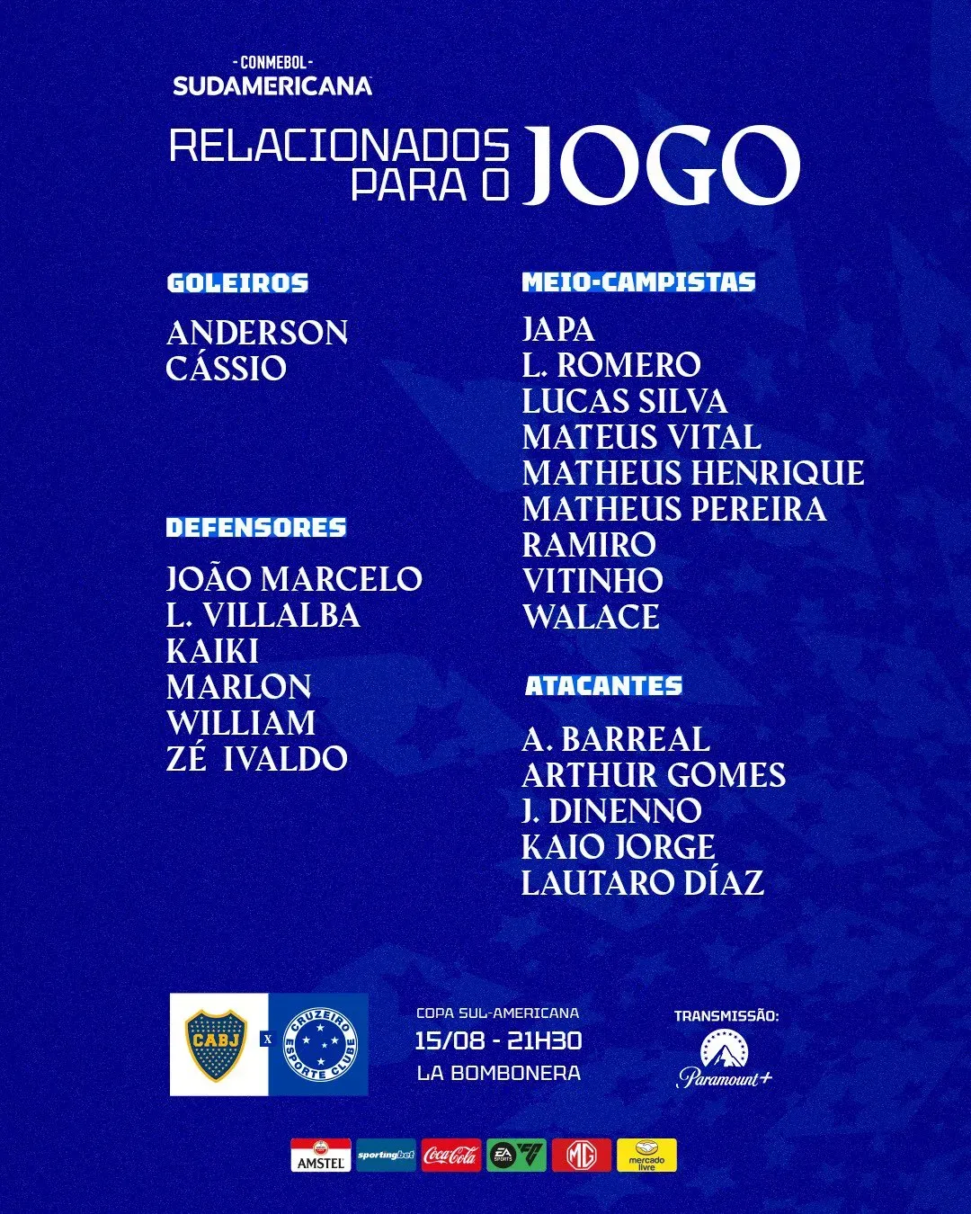 Cruzeiro: Cássio; William, José Ivaldo, Joao Marcelo, Marlon; Lucas Romero, Lucas Silva; Matheus Pereira, Álvaro Barreal, Lautaro Díaz; Kaio Jorge. DT: Fernando Seabra.