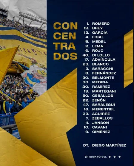 El Xeneize sale a la cancha con: Sergio Romero; Luis Advíncula, Cristian Lema, Marcos Rojo, Lautaro Blanco; Kevin Zenón, Cristian Medina, Pol Fernández, Agustín Martegani; Miguel Merentiel y Milton Giménez.