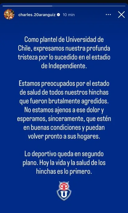 “Como plantel de Universidad de Chile expresamos nuestra profunda tristeza por lo sucedido en el estadio de Independiente. Estamos preocupados por el estado de salud de todos nuestros hinchas que fueron brutalmente agredidos. No somos ajenos a este dolor y esperamos, sinceramente, que estén en buenas condiciones y puedan volver pronto a sus hogares. Lo deportivo queda en segundo plano. Hoy la vida y la salud de los hinchas es lo primero”, escribió el capitán del equipo chileno en una historia que compartió en Instagram.