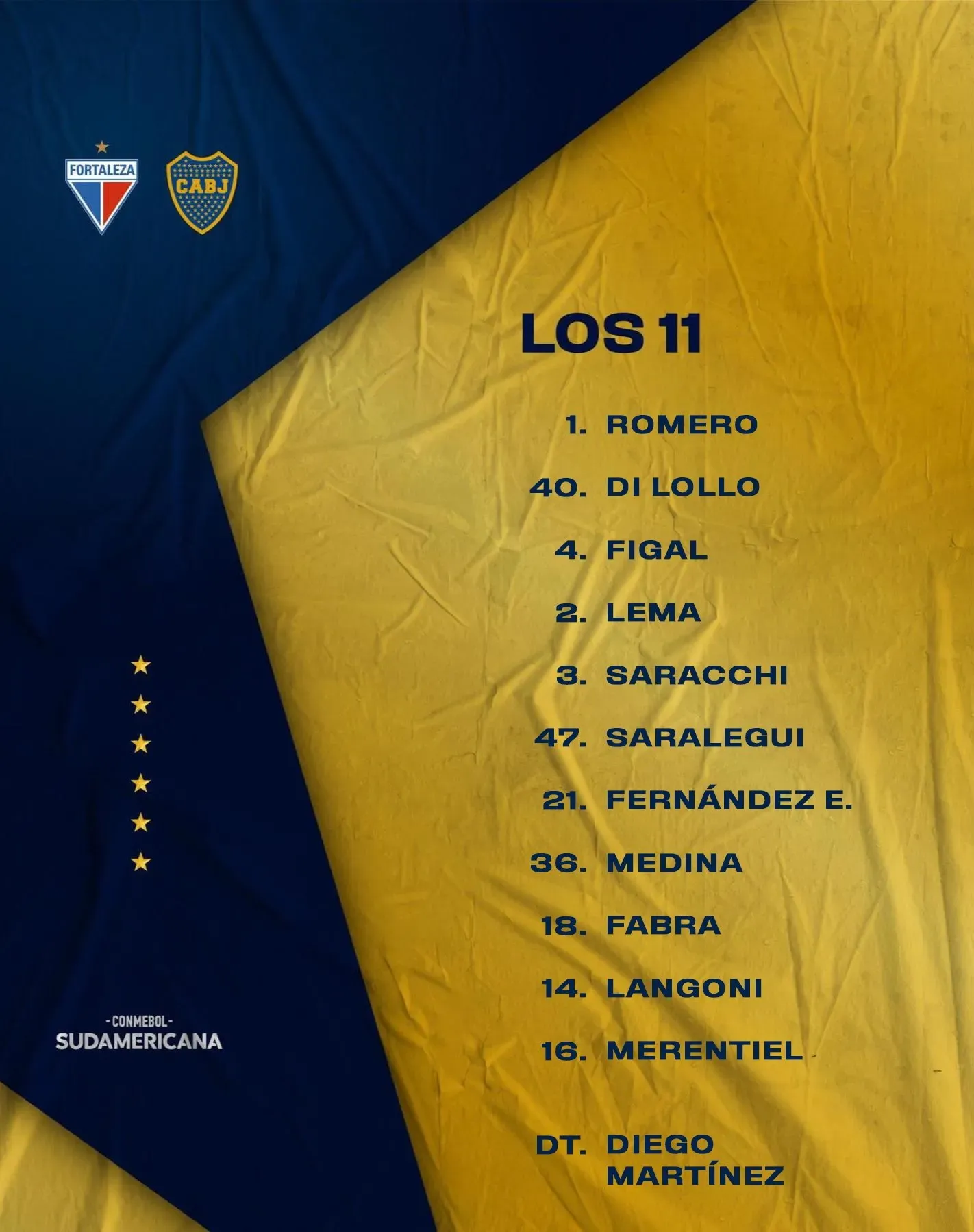 Por su parte, el Xeneize sale a la cancha con: Sergio Romero; Lautaro Di Lollo, Cristian Lema, Nicolás Figal, Marcelo Saracchi; Jabes Saralegui, Cristian Medina, Equi Fernández, Frank Fabra; Luca Langoni y Miguel Merentiel.