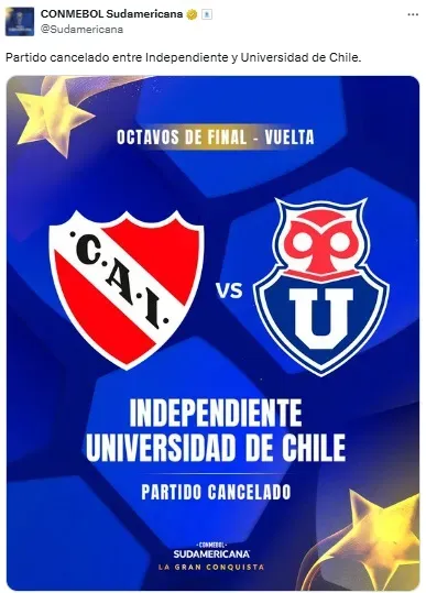 Desde las redes sociales de Universidad de Chile lanzaron un comunicado oficial en donde informan la medida que tomaron desde las autoridades de la Confederación Sudamericana de Fútbol: “El partido fue cancelado (no se reanudará) por CONMEBOL por la falta de garantías de seguridad. La resolución del partido y la llave de octavos de final será comunicada por la propia CONMEBOL”, indicaron.