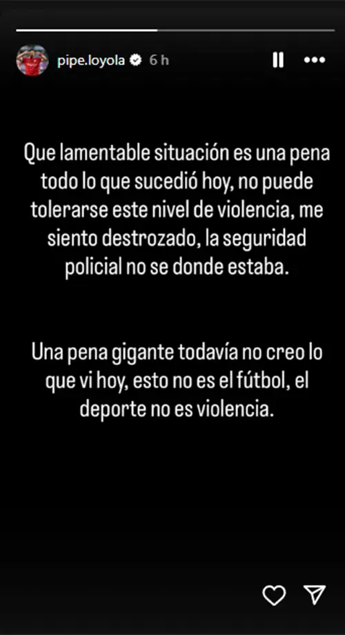 “Qué lamentable situación. Es una pena todo lo que sucedió hoy. No puede tolerarse este nivel de violencia. Me siento destrozado. La seguridad policial no sé dónde estaba. Una pena gigante. Todavía no creo lo que vi hoy. Esto no es el fútbol. El deporte no es violencia”, expresó el jugador del Rojo y de la Selección de Chile a través de una historia de Instagram.
