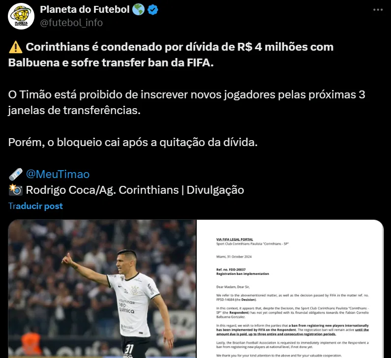 Mientras se prepara para el el duelo ante Racing en Avellaneda por las semifinales de la Copa Sudamericana, a Corinthians le llegó una durísima noticia desde FIFA. En concreto, al cuadro brasileño llegó una sanción disciplinaria de parte del ente máximo del fútbol mundial debido a una deuda pendiente con el futbolista paraguayo Fabián Balbuena.