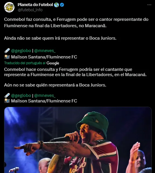 Lo cierto es que, mientras Boca espera por la confirmación tanto de la banda como de CONMEBOL para que Pablito y todo Damas Gratis den el puntapié de la final con su música, desde Fluminense ya lanzaron a su candidato para el show. En concreto, según reveló el diario Globo de Brasil, quien podría tocar para el bando del Flu es el cantante Ferrugem.