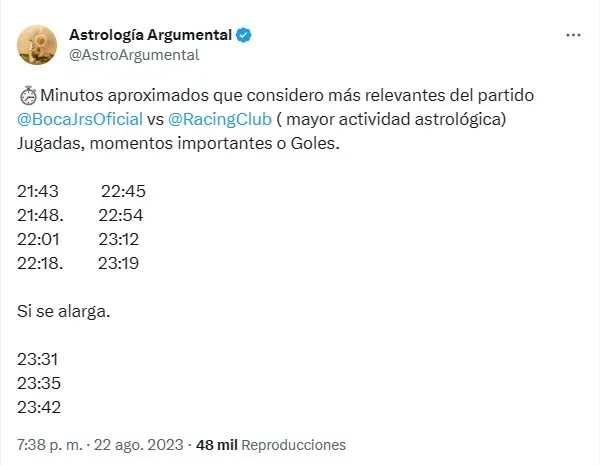 Después del impacto que generó en redes sociales el pronóstico del astrólogo de Boca Giorgio Armas, alegando que “el que pase de la series Olimpia – Fluminense y Boca – Racing serán finalistas”, uno de sus colegas se la “jugó” difundiendo los minutos en donde pasarán las jugadas más importantes del clásico de este miércoles en el estadio Alberto J. Armando.