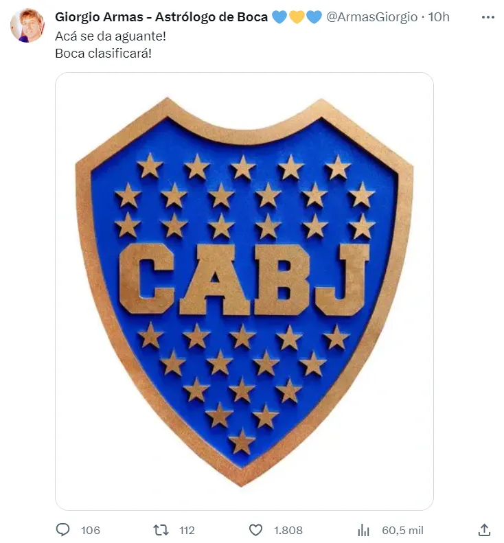 “¡Tranquilidad! Aguante Boca”, fue lo primero que escribió Giorgio apenas finalizó el encuentro. Un par de minutos después, fue contundente: “¡Acá se da aguante! ¡Boca clasificará!”. Según el astrólogo, los dirigidos por su amigo Jorge Almirón celebrarán en el Cilindro el próximo 30 de agosto.
