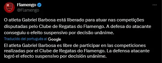 En su cuenta de Twitter, el club de Río de Janeiro anunció que Gabigol recibió la habilitación para regresar al campo de juego: “El atleta Gabriel Barbosa es libre de participar en las competiciones realizadas por el Clube de Regatas do Flamengo. La defensa atacante logró el efecto suspensivo por decisión unánime“, expresó el Mengao.