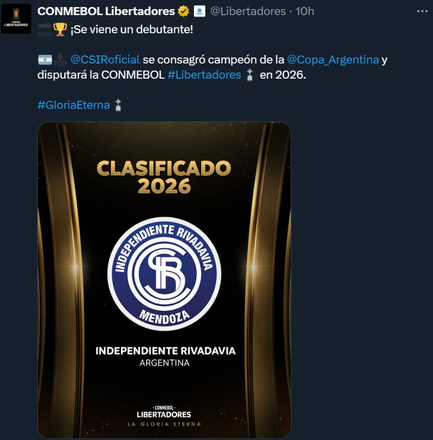 Con esta conquista, Independiente Rivadavia jugará la Copa Libertadores 2026 y esta será su primera participación en el torneo más importante del continente. El equipo de Alfredo Berti iniciará su camino directamente desde la fase de grupos.