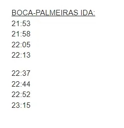 21:53, 21:58, 22:05 y 22:13, fueron los horarios para las situaciones claves del primer tiempo, que como el partido comienza 21:30, ocurrirán en los minutos 23, 28, 35 y 43, mientras que los horarios del segundo tiempo son 22:37, 22:44, 22:52 y 23:15. Para estos, ya no se puede prever en que minutos pasarán, debido a que el complemento puede variar en su inicio acorde al desarrollo del juego.