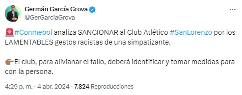 Ahora, CONMEBOL analiza sancionar a San Lorenzo por el accionar de su seguidora. Sin embargo, el club porteño tiene la posibilidad de alivianar el fallo si consigue identificarla y tomar medidas internas contra ella.