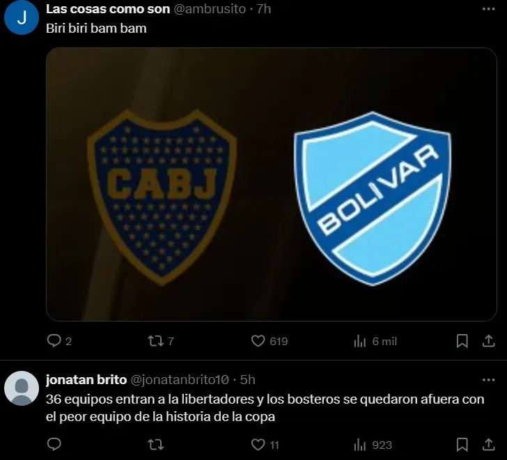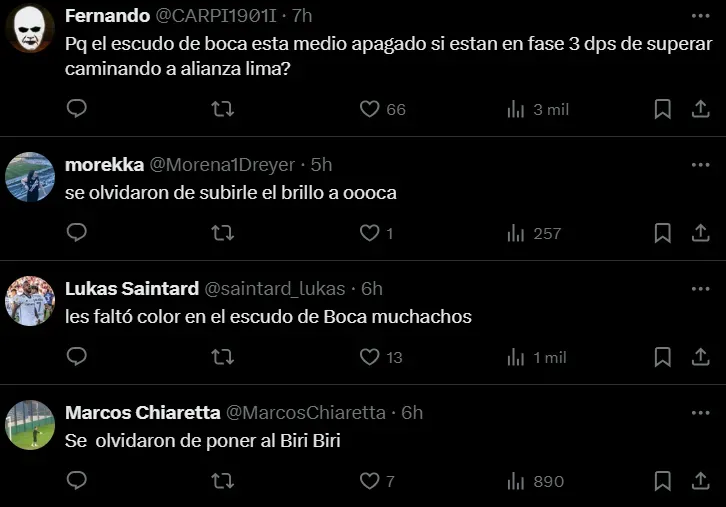 Los escudos fueron establecidos por orden alfabético y en la primera fila aparecen Alianza Lima -verdugo del Xeneize-, Atlético Nacional, Bahía, Barcelona y Bolívar en su color normal, mientras que Blooming y Boca tienen sus escudos apagados. Como era de esperar, en un mundo repleto de chicanas y gastadas como lo es el de las redes sociales, fueron decenas de hinchas de River que comentaron la publicación con cargadas para el rival de toda la vida.