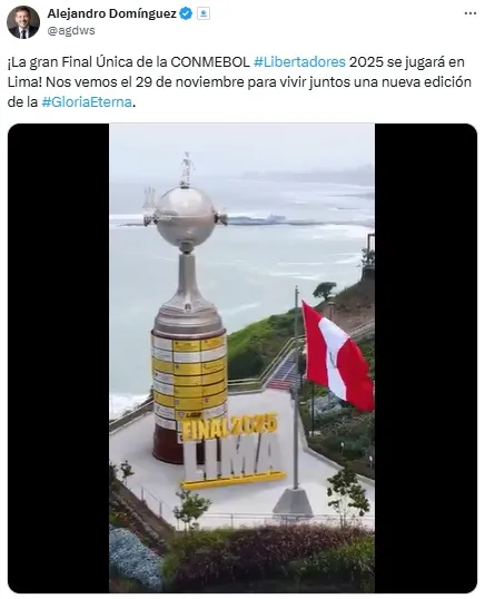 “¡La gran Final Única de la CONMEBOL #Libertadores 2025 se jugará en Lima! Nos vemos el 29 de noviembre para vivir juntos una nueva edición de la #GloriaEterna”, anunció Domínguez en sus redes sociales.