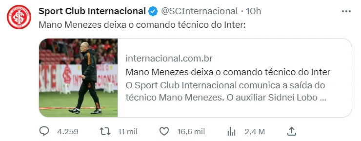 El conjunto de Porto Alegre anunció la salida de Mano Menezes por malos resultados tras haber igualado sin goles ante Palmeiras como local. “El club agradece a los profesionales su dedicación, compromiso y trabajo realizado durante el período, deseándoles suerte y éxito en la secuencia de sus carreras”, escribieron en un comunicado.