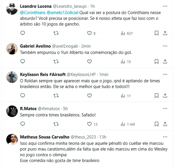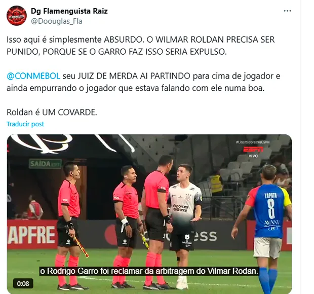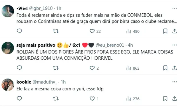 “Vergonzoso. Se nota la clase de persona que es. No puede tocar a los jugadores”, apuntó otro usuario. “A Roldan se lo comió el personaje hace bastante tiempo. Tiene pinta de que no termina bien su carrera”, opinó un tercero. “¿Cuál será la postura del Corinthians ante este disparate? Necesitas posicionarte. Si es nuestro atleta quien le hace esto al árbitro, son 10 juegos de sanción”, manifestó un hincha del Timao. “Roldán es uno de los peores árbitros. Además de su ego, sanciona cosas absurdas con una horrible convicción”, señaló otro.