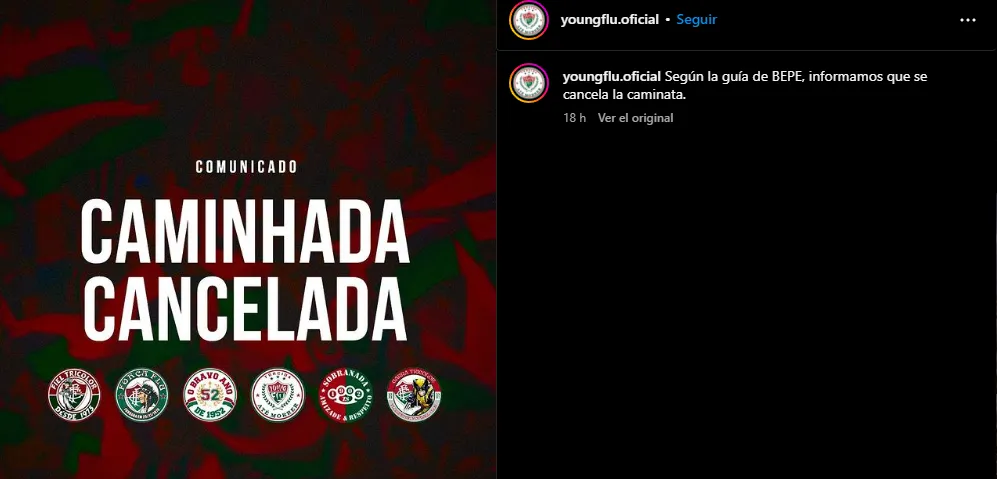 Teniendo en cuenta este contexto, desde Fluminense tomaron una decisión en las últimas horas que llamó la atención, ya que comunicaron un cambio de planes respecto a la previa. En concreto, desde una de las cuentas más reconocidas de hinchas del conjunto carioca, conocido como “Young Flu” comunicaron que finalmente darían marcha atrás en la caminata que había organizada desde la sede del club hasta el Maracaná.