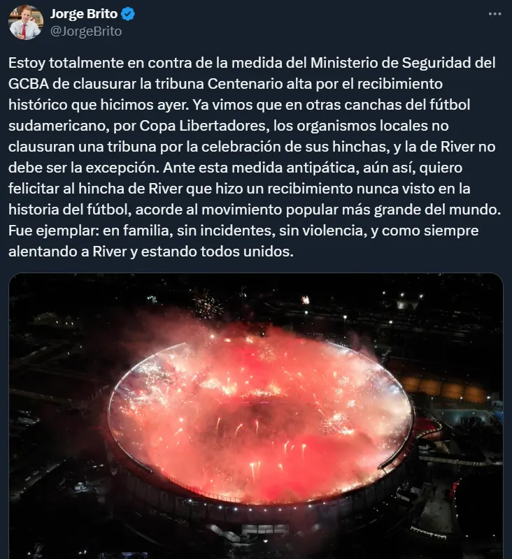 “Ya vimos que en otras canchas del fútbol sudamericano, por Copa Libertadores, los organismos locales no clausuran una tribuna por la celebración de sus hinchas, y la de River no debe ser la excepción”, profundizó Brito, mostrándose muy enérgico.