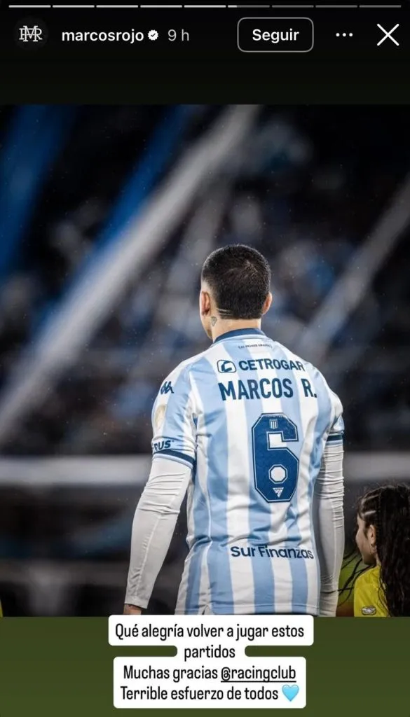 “Que alegría volver a jugar estos partidos. Muchas gracias, Racing. Terrible esfuerzo de todos“, escribió Rojo en su cuenta oficial de Instagram, celebrando la agónica clasificación a cuartos de final. Junto al escrito, una imagen suya con la 6 y el “Marcos R.” en la espalda.