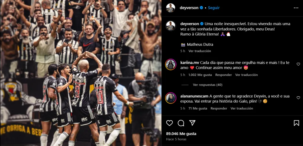 Luego del triunfazo que deja a Mineiro cerca de la clasificación a la final de la Libertadores, el atacante del Galo regresó a su casa a altas horas de la madrugada. Apenas arribó, además de mostrarse en redes con su esposa y sus allegados con felicidad por el resultado obtenido, Deyverson realizó también un posteo en su cuenta de Instagram en el que celebró la victoria y sus dos goles.