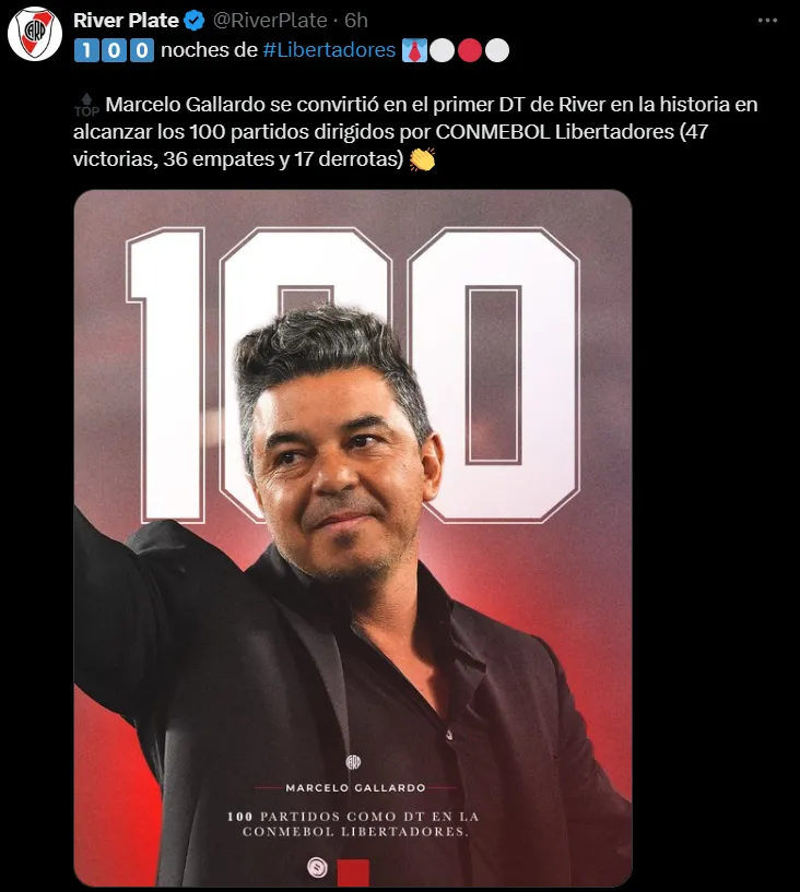 No pasó inadvertido el récord que consiguió Marcelo Gallardo en Quito ante Independiente del Valle: fue su partido número 100 dirigiendo a River por Copa Libertadores y de esta manera se convirtió en el primer DT en llegar al centenar con un mismo equipo en el torneo más importante del continente. Cabe destacar que en total son 106 los encuentros del Muñeco como entrenador en este certamen ya que hay que sumar los 6 en los que condujo a Nacional de Montevideo.