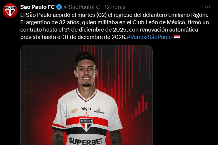 A través de sus redes sociales, el conjunto paulista compartió: “El São Paulo acordó el martes (02) o el regreso del delantero Emiliano Rigoni. El argentino de 32 años, quien jugó en el Club León de México, firmó un contrato hasta el 31 de diciembre de 2025, con renovación automática prevista hasta el 31 de diciembre de 2026”. Cabe recordar que Emiliano Rigoni vistió la casaca de Sao Paulo entre 2021 y 2022, en ese período disputó 70 partidos, en los que marcó 13 goles y brindó 9 asistencias.