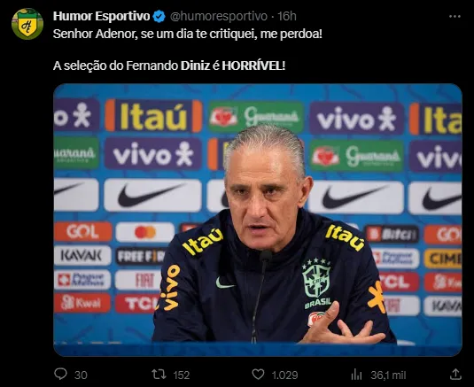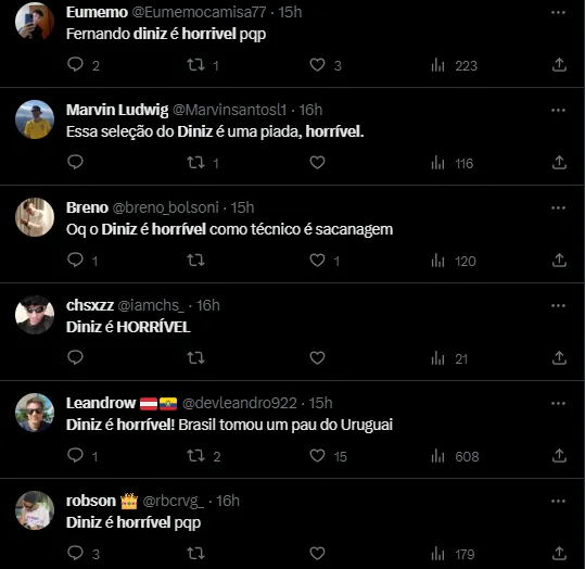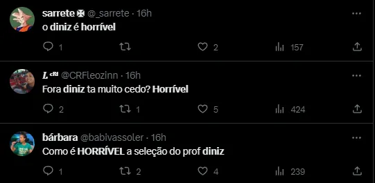 Entre las tendencias que aparecieron en las redes sociales en Brasil, Diniz fue definido por los hinchas del Scratch como un “técnico horrible”, además de sentenciar que elaboró una táctica que perjudica a Vinicius Jr, actual figura del equipo, y que enfatiza el juego de Neymar, apagado en los últimos meses y foco de críticas para los torcedores brasileños.
