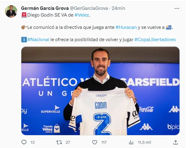 Según informa el periodista Germán García Grova, Diego Godín dejará de ser jugador de Vélez, y ya le comunicó su decisión a la dirigencia del Fortín, por lo que contra Huracán tendrá su último partido, para luego volverse a Uruguay, en donde Nacional es el principal candidato a quedárselo, ya que le ofrece la posibilidad de disputar la Libertadores.