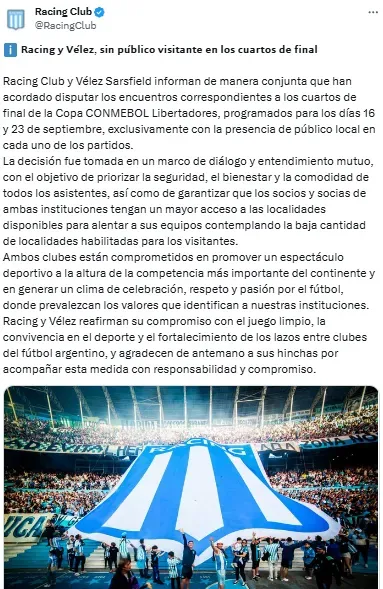 Racing Club y Vélez Sarsfield informan de manera conjunta que han acordado disputar los encuentros correspondientes a los cuartos de final de la Copa CONMEBOL Libertadores, programados para los días 16 y 23 de septiembre, exclusivamente con la presencia de público local en cada uno de los partidos.