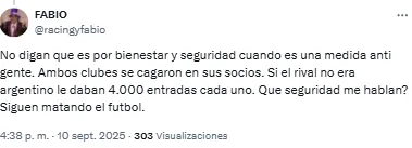 En redes sociales, esta medida generó malestar entre los fanáticos de ambos clubes, que soltaron fuerte críticas. “Es una medida anti gente. Si el rival no hubiese sido argentino le habrían dado 4 mil entradas. Siguen matando el fútbol”, disparó un hincha de Racing. Otro, de Vélez, soltó: “Solo en Argentina pasan estas cosas”.