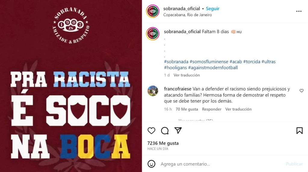“Pra racista é soco na boca”, escribieron desde la cuenta oficial que la torcida de Fluminense posee en Instagram, donde justo a la última palabra la pintaron de azul y amarillo. En castellano, lo que sostuvieron es que “para un racista, es un puñetazo en la boca”. De esta manera, dejaron bien en claro que atacarán a todos los argentinos que deambulen por las cercanías al Maracaná, por las playas de Copacabana e Ipanema, como así también por Laranjeiras.