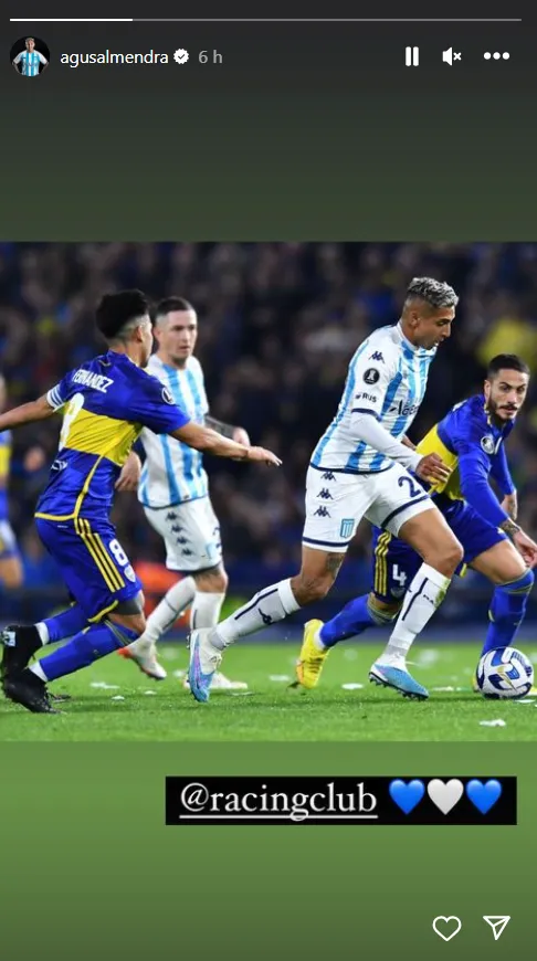 “A todos los traidores los vamos a matar”, “Almendra, hijo de p…, la p… que te parió”, fueron algunas de las canciones que le dedicaron al volante de 23 años. Tras una discreta actuación en el 0 a 0 (hizo el único tiro al arco de Racing en el partido y más tarde fue amonestado), apareció en sus redes.