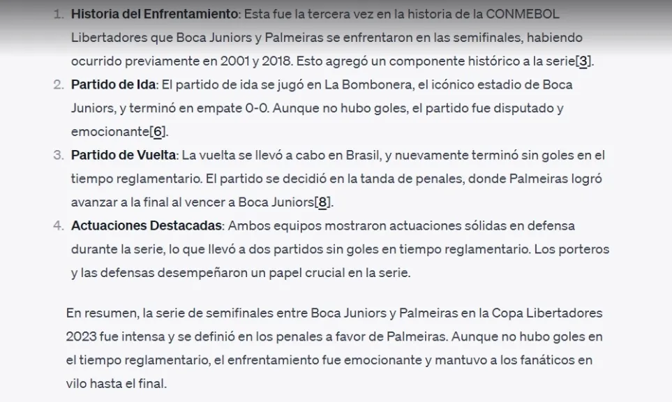 “La vuelta se llevó a cabo en Brasil y nuevamente terminó sin goles en el tiempo reglamentario”, comenzó el bot impulsado por IA en un intento por adelantarse a los hechos. El final fue de infarto: “El partido se decidió en la tanda de los penales, donde Palmeiras logró avanzar a la final al vencer a Boca Juniors”.