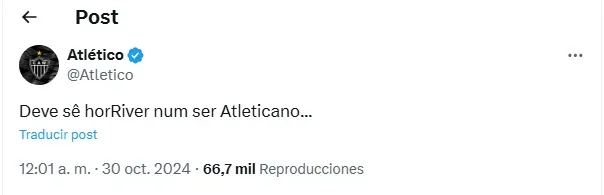 Luego de esto, volvió a chicanear con un “Deve se horRiver num ser Atleticano (debe ser horrible no ser atleticano)”, nombrando al Millonario. Por último, tiró un video en el que muestran la camiseta del club junto a una pequeña Copa Libertadores, por la que irán el próximo 30 de noviembre.