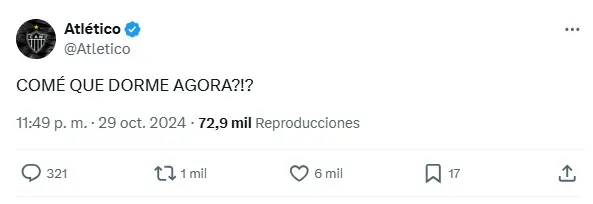 Una vez finalizado el encuentro y consumada la clasificación al partido definitorio, la cuenta oficial de Atlético Mineiro subió una serie de posteos en las que celebró este importante triunfo. Además, aprovecharon para chicanear sutilmente al Millonario tras el accionar de sus hinchas.