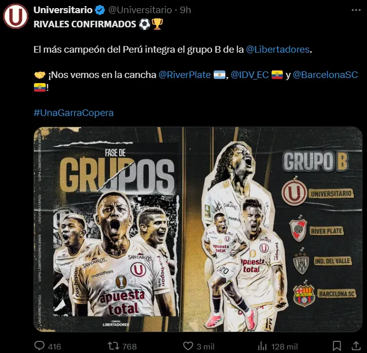 El segundo rival que conoció River fue Universitario de Perú y los de Lima esperaron a que esté el grupo confirmado para publicar una placa con la información básica y lanzaron un tuit que decía: “Rivales confirmados. El más campeón del Perú integra el Grupo B de la Copa Libertadores. ¡Nos vemos en la cancha River, Independiente del Valle y Barcelona”.