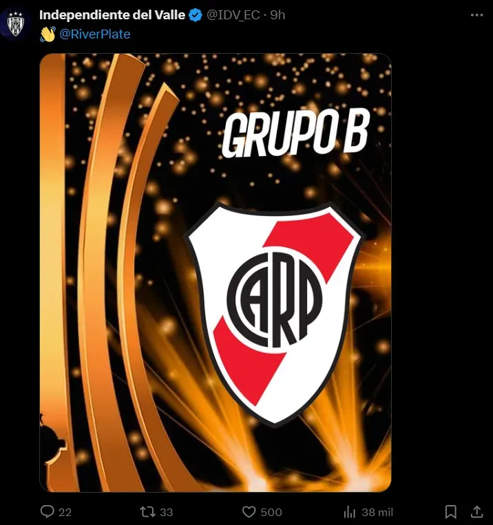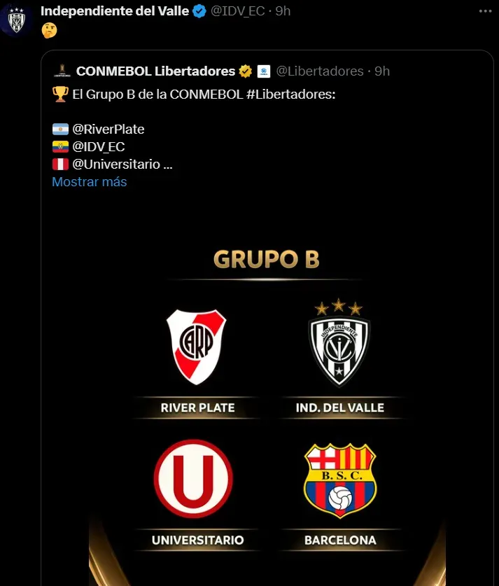 El primer rival confirmado de los de Marcelo Gallardo fue Independiente del Valle y los de Quito tuvieron dos reacciones en sus redes sociales oficiales: la primera fue postear una foto con el escudo del Millonario con un emoji de saludo y el arroba correspondiente a la cuenta oficial de los de Núñez. Con el grupo confirmado, los ecuatorianos comentaron la publicación de la cuenta de la Libertadores con la placa de todo el Grupo B y un emoji de una cara dubitativa.