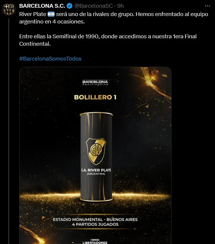 Luego, le dedicaron un posteo a cada uno de sus rivales y el de River decía: “River Plate será uno de los rivales del grupo. Hemos enfrentado al equipo argentino en 4 ocasiones. Entre ellas la semifinal de 1990, donde accedimos a nuestra primera final continental”. Cabe recordar que aquella serie quedó para los ecuatorianos al imponerse por penales, luego caerían ante Olimpia en la final.