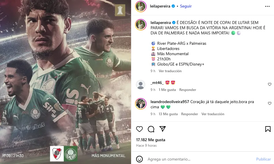 “¡Es una decisión! ¡Es noche de Copa! ¡A seguir luchando duro! ¡Buscaremos la victoria en Argentina! ¡Hoy es día de Palmeiras y nada más importa!”, compartió la empresaria de 60 años en un posteo en su cuenta de Instagram.
